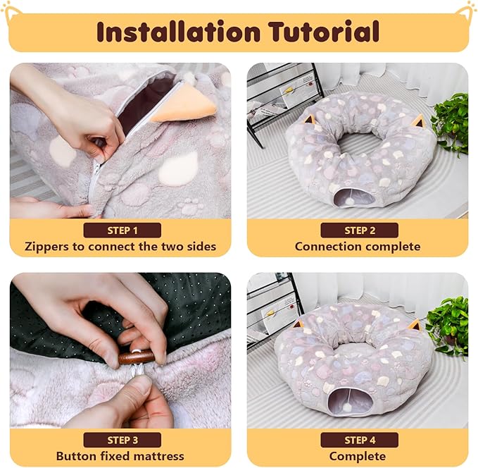 - 【Sizes】: Once assembled, the cat tunnel bed has a diameter of 40 inches, the diameter of the tunnel opening is 11.8 inches. The diameter of the mat is 20 inches. It is recommended for pets weighing under 25 pounds.