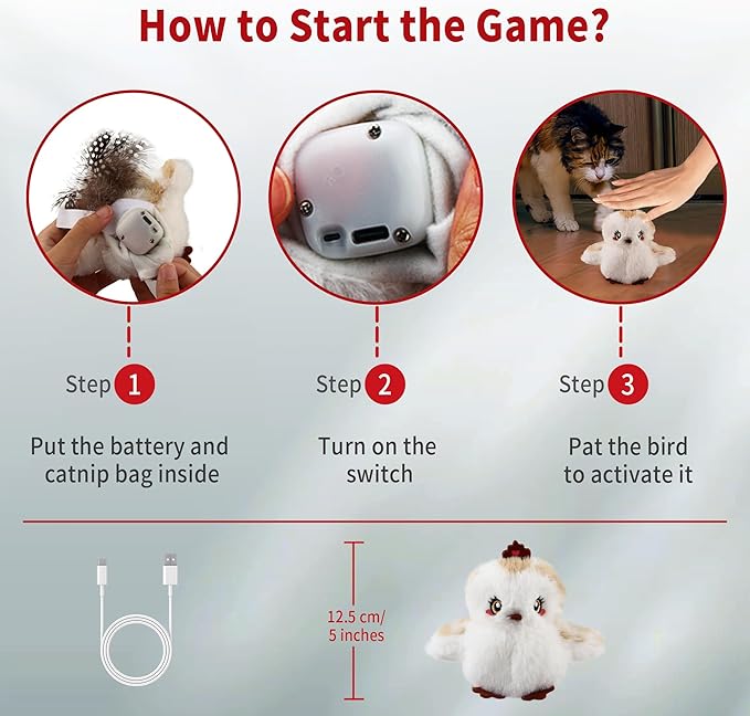 - SAFE & SOFT MATERIAL: The automatic cat toys with realistic feather tail are made of soft, safe, and relatively bite-resistant plush for your kitty. We add high-quality North-American catnip bag inside. The chirping bird cat toys packed in one exquisite packing box are appropriate cat birthday toys or cat Festival presents!