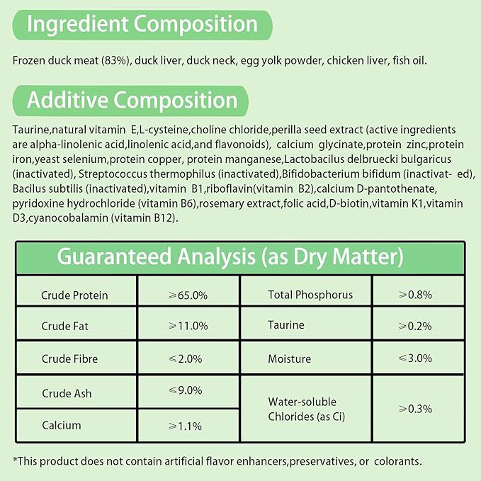 - 【Ingredient Composition】Frozen duck meat 83%, duck liver, duck neck, egg yolk powder, chicken liver, fish oil.