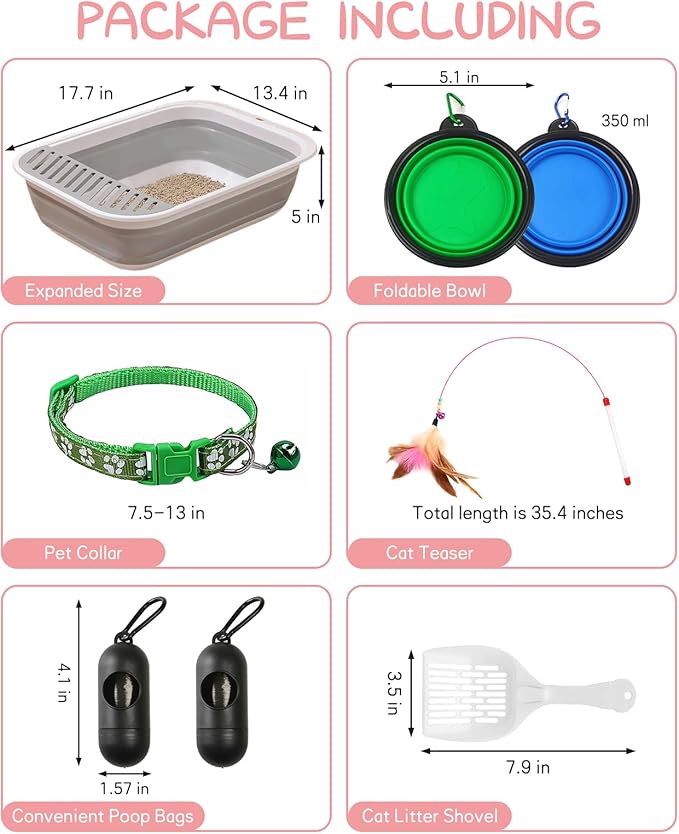 - Small Cat Starter Kits: Travel kitten toilet set includes one kitten cat boxes, one cat litter shovel, two travel cat bowls, one cat teaser, one adjustable cat collar with a bell and two Rolls Poop Bags with Dispenser and Leash Clip