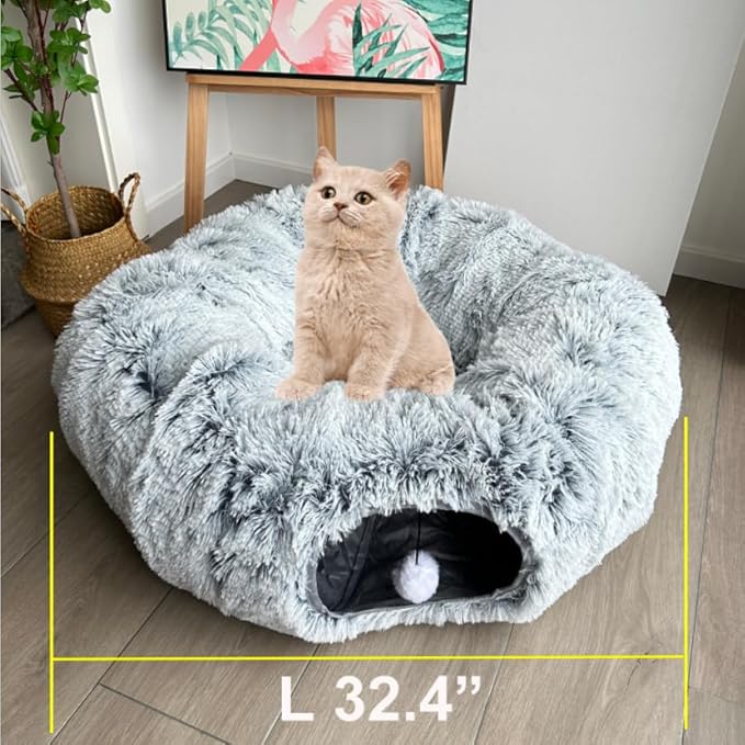 Cat Tunnel Bed, Tunnels for Indoor Cats Soft Warm Light Grey Plush, Collapsible Interactive Tube Toys, Maze House with Peek Holes Dangling Ball for Rabbit, Kitten, Kitty, Puppy