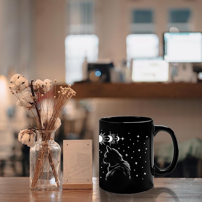 - With its black color and imagery associated with goth style such as black cats, moons, and stars, this witch mug creates a mysterious ambiance. It can help you create a personal space where you can relax and enjoy moments of tranquility.