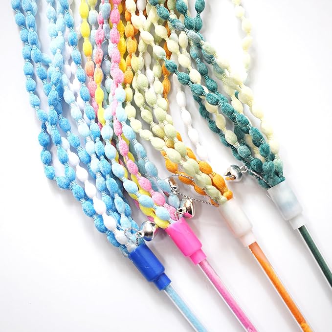 - Made by safe material. No feathers or small pieces to get lost or eaten. Colorful and long enough to have lots of cat play