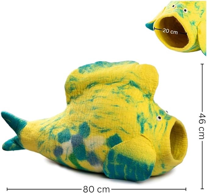 Luxurious Eco-Friendly Merino Wool Cat Cave Bed Fish Design - Foldable Hideaway Pod for Indoor Cats - Premium Felt Kitten Beds - Covered Cat House for Ultimate Cozy Comfort by Woolygon