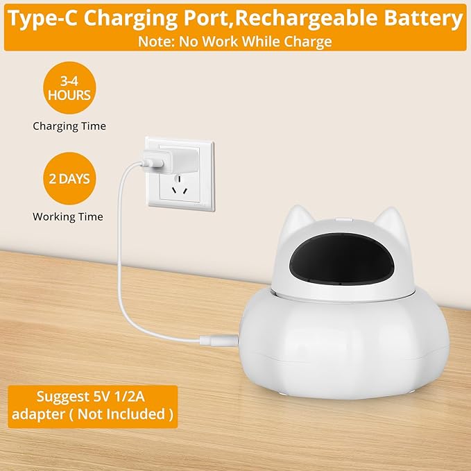 - USB Rechargeable: Rechargeable cat toy fully charges about 3-4 hours, then work for 40hours, approximately 2 days of use or longer; Support any device with USB port charging, such as 5V 1-2Aadapter. Cat toys interactive can't be worked while charging