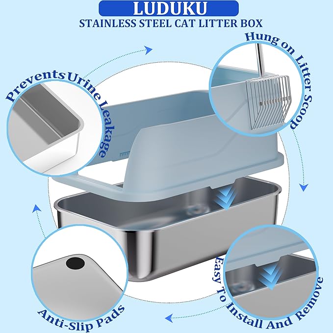 - Four anti slip pads on the bottom of the litter box makes the litter box more stable; Stainless steel material makes the litter box sturdy and durable that can use it for more than 12 years; And it's not easy to leave scratches on the steel litter box
