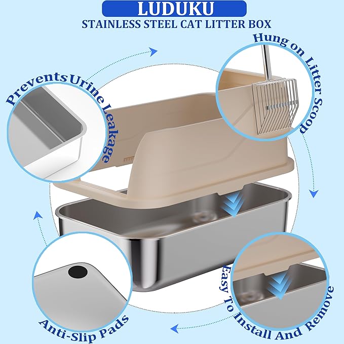 - Four anti slip pads on the bottom of the litter box makes the litter box more stable; Stainless steel material makes the litter box sturdy and durable that can use it for more than 11 years; And it's not easy to leave scratches on the steel litter box
