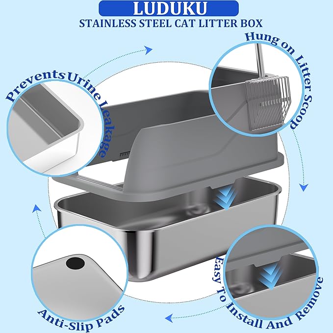 - Four anti slip pads on the bottom of the litter box makes the litter box more stable; Stainless steel material makes the litter box sturdy and durable that can use it for more than 10 years; And it's not easy to leave scratches on the steel litter box