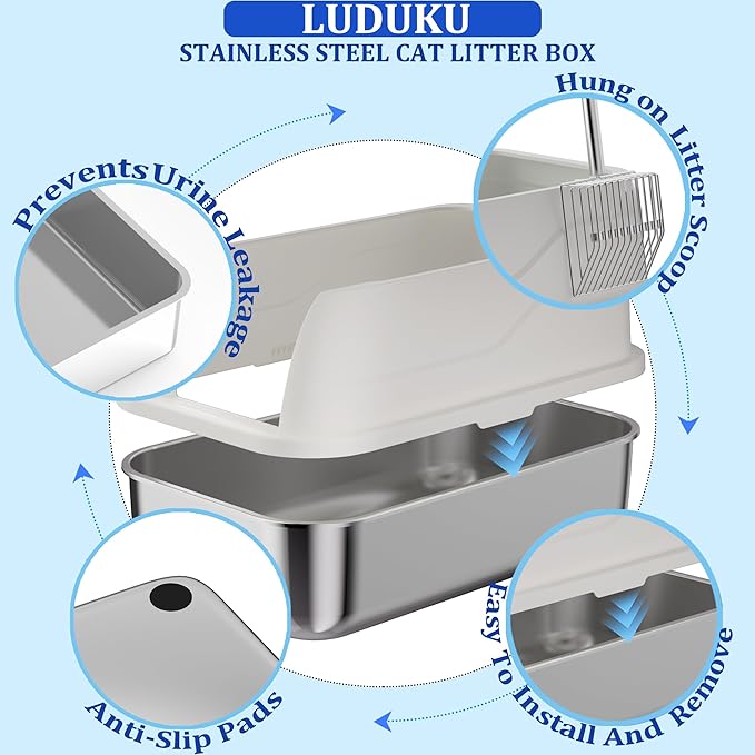 - Four anti slip pads on the bottom of the litter box makes the litter box more stable; Stainless steel material makes the litter box sturdy and durable that can use it for more than 9 years; And it's not easy to leave scratches on the steel litter box