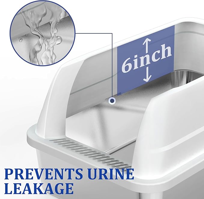- This cat litter box is made of stainless steel material, the litter is not easy to stick to the bottom of the box; Our stainless steel cat litter box enclosure is high enough to prevent litter scatter and urine spilling everywhere