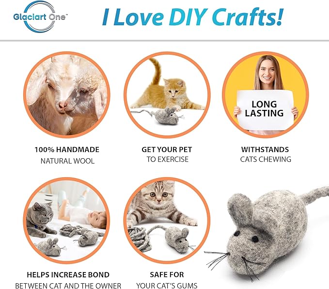 Glaciart One Felt Mouse Cat Toy – Soft Fuzzy Enrichment 100% Natural Wool Toy - Interactive Catnip Play Cat Toy Set - Safe for Pets, Non-AZO Colored Dyes - 100” Long