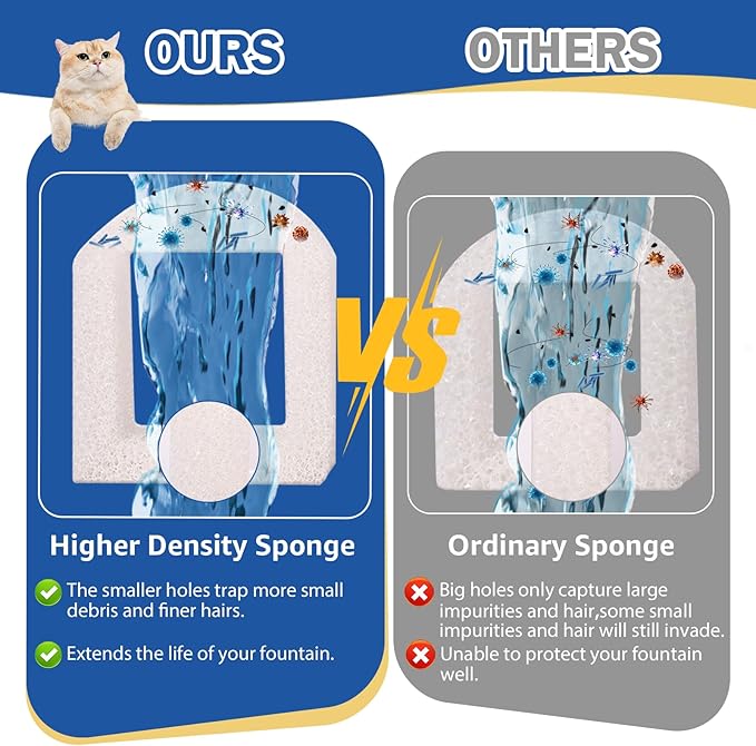 - Higher Density & Strong Purification Effect: Our cat water fountain filter replacement are made of premium and high-density sponges, their pores are denser than those of other brands, which will trap more hairs, foods, heavy metals and other organic debris, so as to keep the pet's water source clean and fresh.
