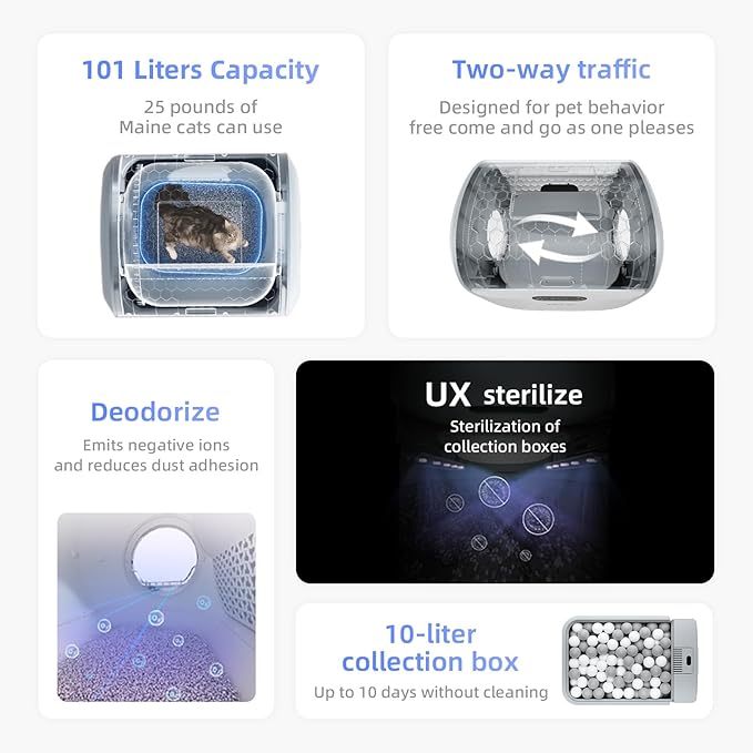 - Convenience Meets Comfort: The Electronic Large Self Cleaning Cat Litter Box is designed for the comfort of large cats or multiple felines. This smart large self-cleaning cat litter box eliminates the need for daily scooping for up to 10 days, ensuring a clean and fresh environment without the use of an app.