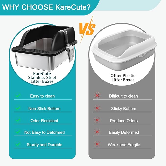 - Doesn't Absorb Odor & Easy Cleaning: Constructed from thick stainless steel for added durability, the litter box stainless steel is designed to withstand daily use, resisting rust and scratches from cat paws. Unlike plastic litter boxes, the non-porous nature feature of the xl litter boxes for big cats also prevents odors from lingering, reducing the need for frequent replacement