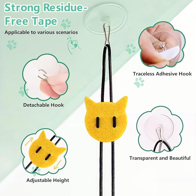 - Additionally, the cat products set comes with clear sticky hooks for added beauty, allowing you to easily hang these cat plush toys in different places. Placing the hanging cat toy slightly higher than the cat's standing height is advised to ensure comfortable play and to maximize their curiosity and activity levels.