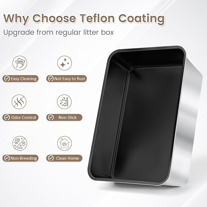 - Teflon Coating for Durability: The cat litter box stainless steel feature a high-quality Teflon coating with exceptional non-stick properties, making them easy to clean and resistant to rust and odorless buildup. The Teflon finish prevents litter and waste from adhering to the surface, ensuring quick and hassle-free maintenance. Experience how easy it is for litter to slide off the Teflon coated steel litter box!