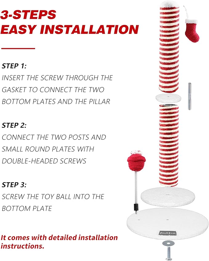 - 【Easy Assembly with Bonus Replacement Ball】:Quick to set up with easy-to-follow instructions, this scratching post also comes with a replacement dangling ball for long-lasting enjoyment. It’s an ideal gift for any cat owner looking to keep their cat entertained and happy through the holiday season and beyond.