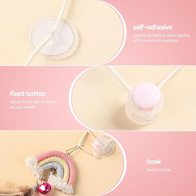 - 【Entertainments for indoor cats】This self-adhesive hanging cat toy combines retractable string and feather, cat's hunting instincts irresistiblly . Swinging the feathers like a bird will make your cats run and jump.