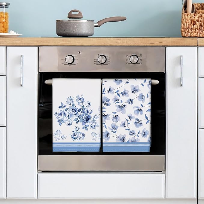 Blue Flower Leaves Tea Towels, 100% Cotton Kitchen Towel Set 20×27.5inch, Multi-Purpose Quick Dry Dish Towels Dishcloths Hand Towels Bar Towels(Set of 4)