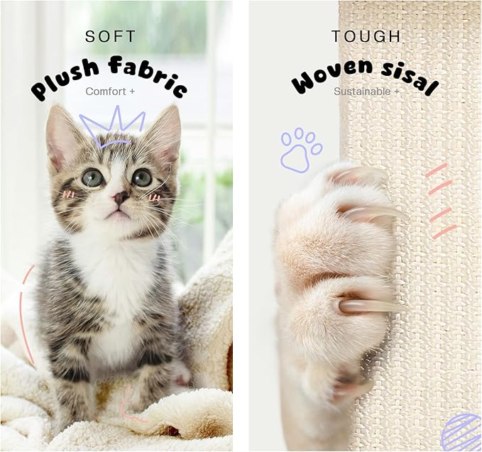 - 【Multifunctional Activity Center】This cat scratching post tower with a multifunctional activity center that includes a sisal post, perch, condo, hammock, and hanging ball, your cat will love exploring and playing