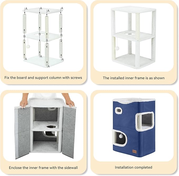 - 【Tri-Level Fun】: Our 2-storey cat house offers two spacious cat bed caves that allow your pets to snuggle, and the upper platform functions as a perch for resting or a fort to survey surroundings; The pass-through hole facilitates unrestricted play between tiers.
