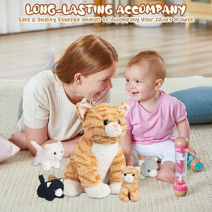 - 【Adorable Cat Plushies for Imaginative Play】So perfect the size of cat plush toys which are easy to carry around when traveling or playing. Our mommy cat and her baby kittens are compact and easy to storage, suitable for any adventure, whether it's a school day or a family vacation. Foster bonding and create lasting memories as your child brings their furry friends along on every journey