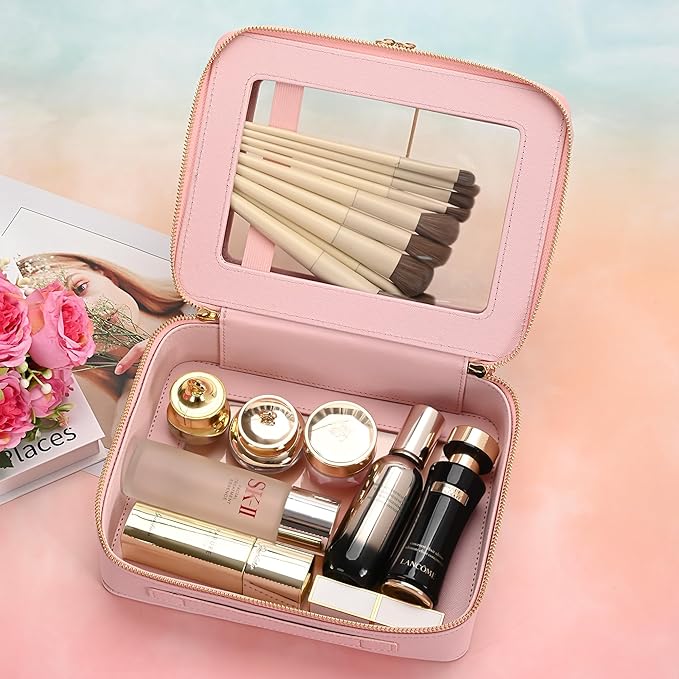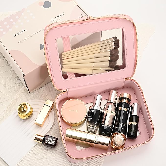 Aveniee Clear Makeup Bags, Double Layer Cosmetic Bags with a Separate Brush Compartment, Travel Toiletry Bag Train Case for Women, Travel Accessories Organizer for Purse(2 Layers Large,Pink)