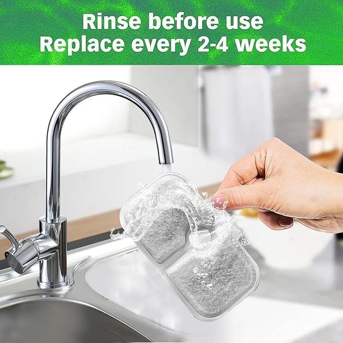 - 【Suggestion】 To get the best results, please soak your filter in water for 5 minutes before use. Rinse the filter with running water to clear away excess carbon dust before use. We recommend replacing the filter every 2 to 4 weeks, depending on how many cats are using the fountain.