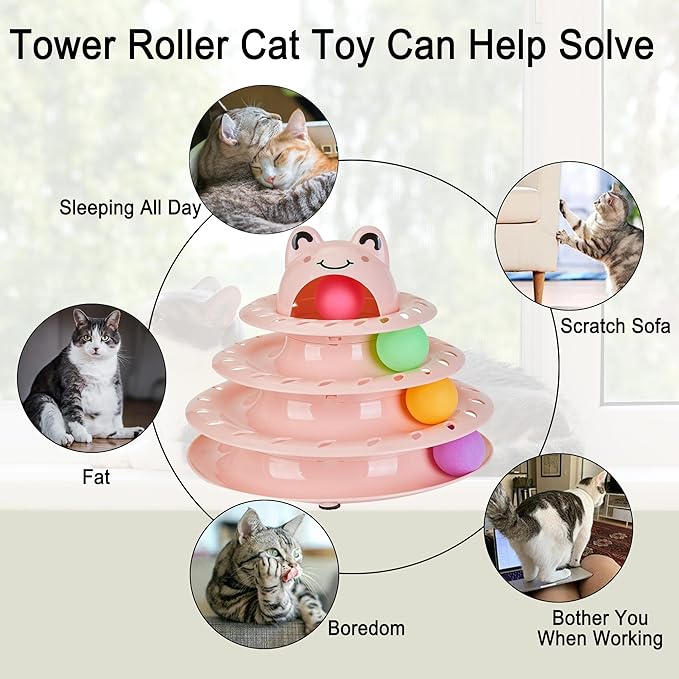 - Interactive Cat Toys: This tower cat toy has 4 level track with 4 colorful balls, Balls spin and roll to excite kittens' desire to play, letting the cats no longer feel bored. You can interact with pet cat. Also the cat can play alone instead of sleep when you are not at home. Help to keep your cat away from clumsy and dull.