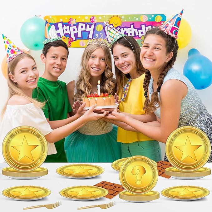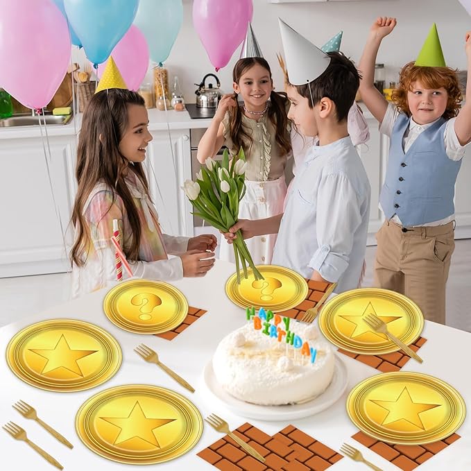 - Game theme design: Channeling the spirit of classic games, our game theme party tableware set features plates adorned with vibrant gold coins and instantly recognizable wall obstacles. Embark on a nostalgic journey filled with excitement and memories. Ideal for game enthusiasts and those who appreciate the thrill of retro gaming.