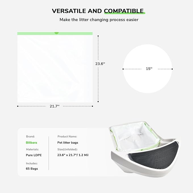 - LDPE Material: The cat litter box bags are made of soft pure LDPE material, which is flexible and durable. They can handle heavy loads without compromising their integrity and withstand pressure without breaking, effectively preventing litter leakage