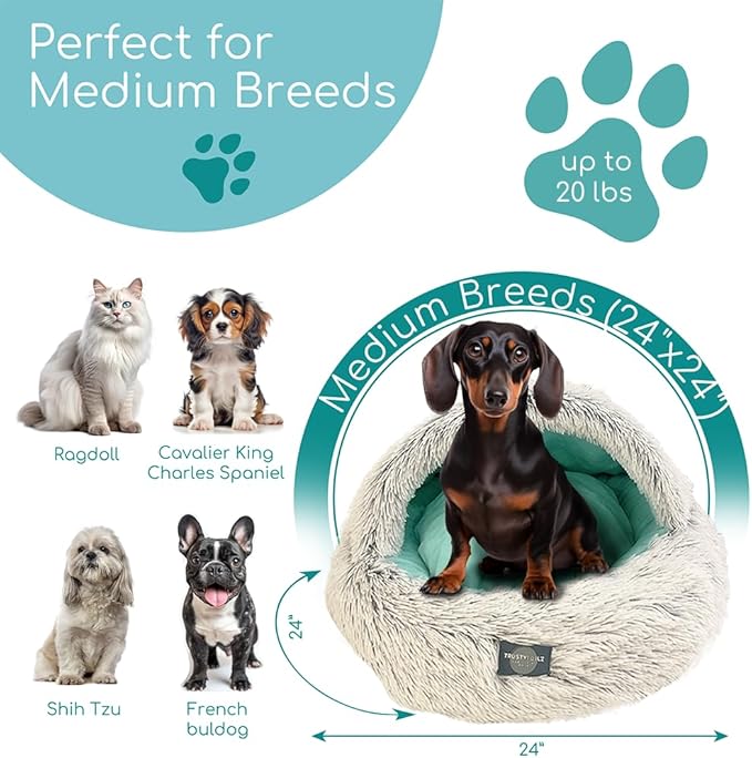 TrustyTailz Cozy Cave Dog Bed and Cat Cave Bed with Hooded Cover, Snap-in Frame, Washable and Removeable, Plush Grey Fluffy Cover Indoor Cats or Small Dog Beds, Non-Slip Base (Medium)