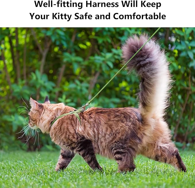 - Escape Proof Pet Harness: This adjustable kitty harness features 3 adjusting slides which allow a just-right fit for your flexible cat. Both sides have a sturdy safety buckle for a more secured closure - never worry about your cat getting lost during outdoor adventures (Tip: There should be room for TWO finger between the harness and any part of the cat's body to ensure flexibility.)