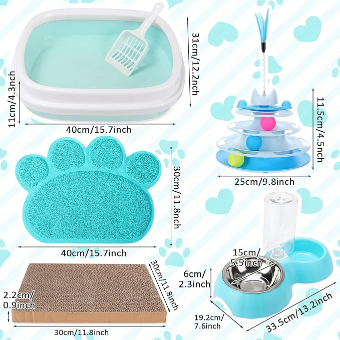 - Comprehensive Kitten Starter Kit: from their first sweet purr to their independence, watch your feline companion grow with our comprehensive kitten starter kit, designed with love, our kit has many things your kitten needs, from their playful kitten stage to their cool, adult cat days; Including a PP, TPR litter box with shovel, a corrugated board scratch pad, an automatic cat bowl, and a turntable kitten toy, this kit is the combo to cater to your kitten's needs