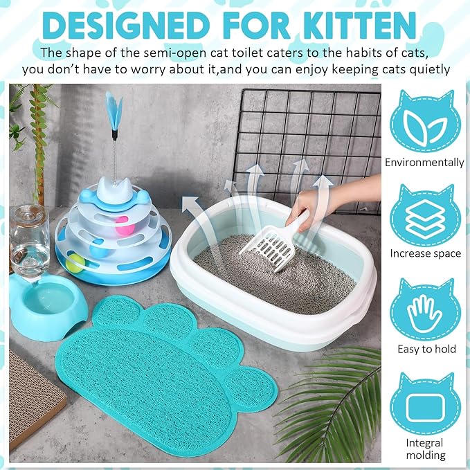 5 Pcs Small Cat Kitten Starter Kit Include Cat Litter Box with Shovel Cat Paw Litter Mat Scratch Pad Automatic Cat Bowls Turntable Cat Toys Balls Cat Essentials Kits for Cats Life(Blue)