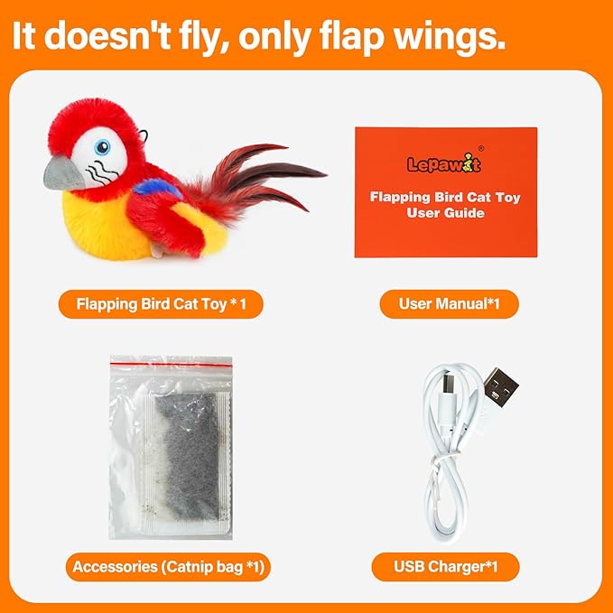 - Flapping Bird Cat Toy (The Bird Does Not Fly) : Make play fantastic with the cat bird toy, which makes lifelike chirping sounds and flapping once playtime begins, beckoning every cat, bite, chew, and chase! Every 20 seconds of operation, chirping bird cat toy will automatically stop, it can be restarted by beating the bird's wings.