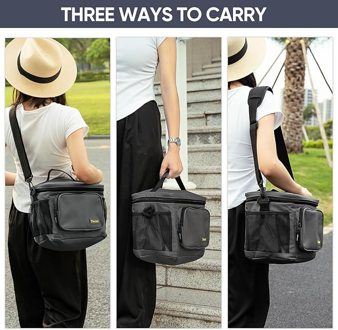 - [SPACIOUS AND VERSATILE] With a generous capacity, this insulated lunch box easily accommodates your entire meal. The spacious main compartment offers ample space, while the front and side pockets provide additional storage for utensils, napkins, keys, or small essentials. The large lunch bags for men measures 11''x8.5''x9.5'', the medium cooler bag measures 10''x8''x8'' and the small measures 9"x5"x7.5"