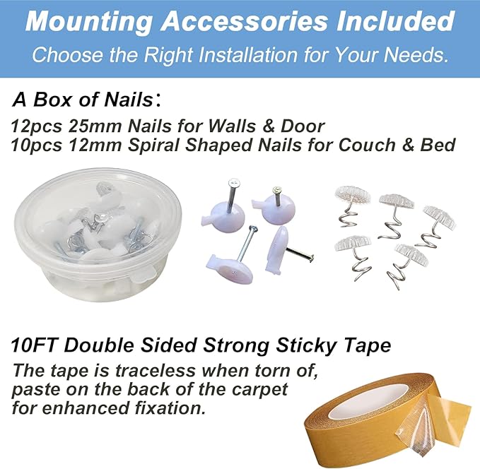 - WHAT YOU WILL RECEIVE: You will receive a roll of cat climbing wall scratcher, a box of nails, which includes 12 pcs 25mm nails, 10 pcs spiral shaped nails, and a roll of 3 meters double sided strong adhesive tap.