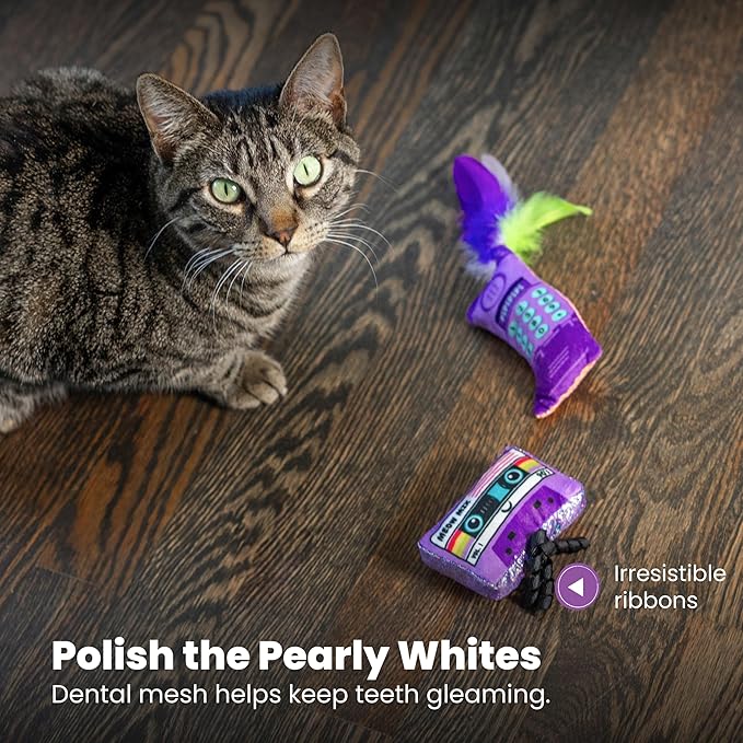 - Three toys included: a sparkly tech pet toy with a rattle and elastic finger, a cassette tape toy with ribbons and dental mesh that plays the best crinkle sounds, and a flip phone toy with purremium features – crinkle, dental mesh, and feathers