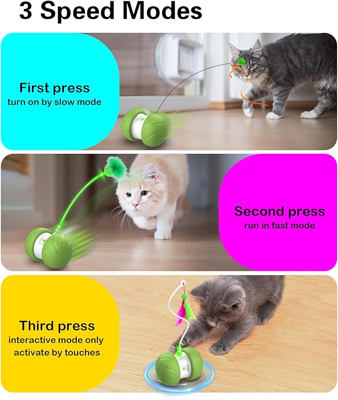 - THREE working modes - Slow mode (Blue lights) moves well on floor, Fast mode (Purple lights) rolls fast on high rug, Interactive mode (Yellow lights) only moves when nudged by your cats. It's cat enrichment toys for indoor cats