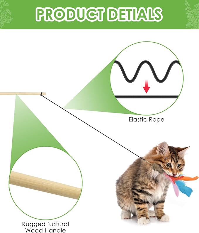 - COLORFUL NATURAL FEATHER - These swaying feather can easily catch the cat’s eyeballs, and the cat will constantly kick and bite them.