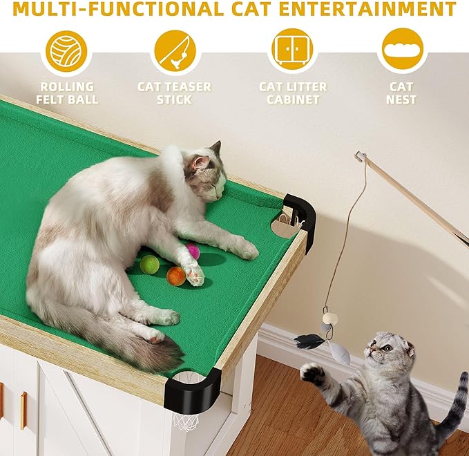 - Multifunctional cat toy: This cabinet can be used either as a cat pool table toy or as a hidden litter box furniture. Plus, 2 feathered teaser sticks and 8 felt ball cat toys to entice your cat to scratching, jumping, and chasing