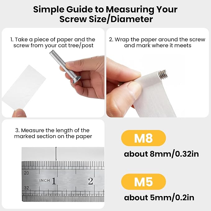 - SCREW COMPATIBILITY - Our refill cat scratching pole is compatible exclusively with M8 screws. Before purchasing, kindly ensure that your cat tree/cat post uses screws with a diameter of 8mm (M8). Refer to the image online for how to measuring screw size