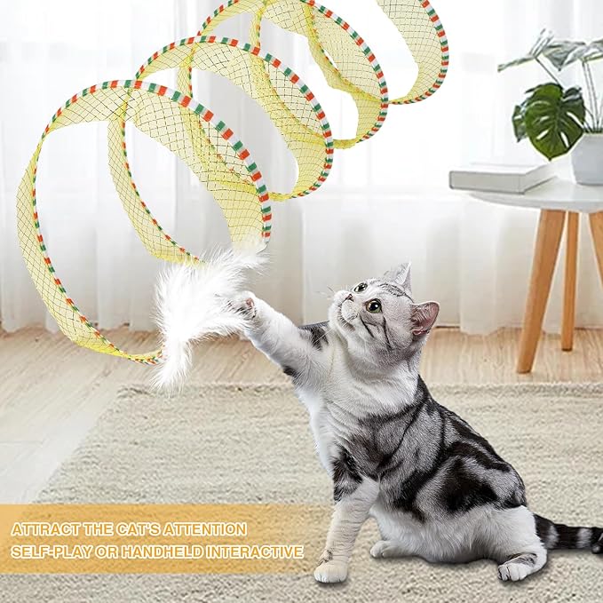 - 【Versatile Design】: ZShireeyblackey cat spiral tunnel toy is not only a foldable cat tunnel but also a interactive cat wand. The tunnel features plush mice, feather teasers, and interactive bells on both ends, which can stimulate your cat's curiosity and provide endless entertainment. It is the perfect indoor play and exploration toy for cats.