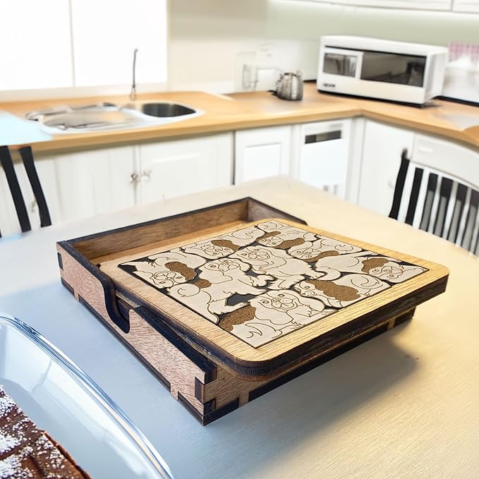 - Engage Your Mind and Protect Your Surfaces: Experience the perfect blend of practicality and play with our Dog Puzzle Wooden Coaster Set. Designed for dog enthusiasts and puzzle lovers alike, this set offers a unique twist on the traditional coaster.