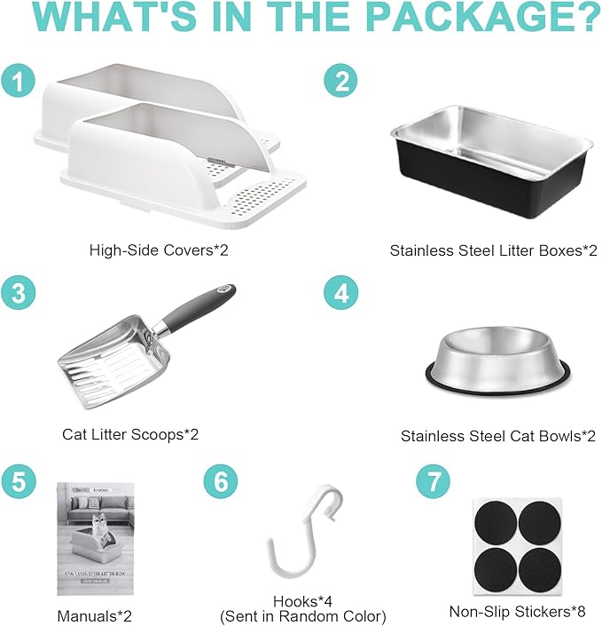 - Reduced Litter Scatter: The widened litter filter footboard in the stainless litter box provides a specific advantage in preventing cats from easily taking litter out of the steel cat litter box. It can collect the cat litter on the cat's paws, keep the floor clean and save on the amount of cat litter used.-- Comes with a metal litter scoop and two hooks (Sent in Random Colors) to make cleaning easier