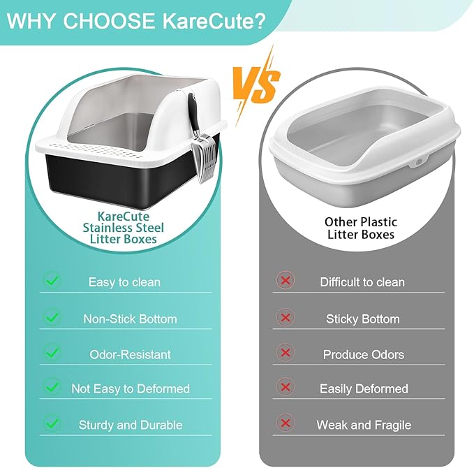 - Doesn't Absorb Odor & Easy Cleaning: Constructed from thick stainless steel for added durability, the litter box stainless steel is designed to withstand daily use, resisting rust and scratches from cat paws. Unlike plastic litter boxes, the non-porous nature feature of the stainless steel litter box with lid also prevents odors from lingering, extending the lifespan and reducing the need for frequent replacement