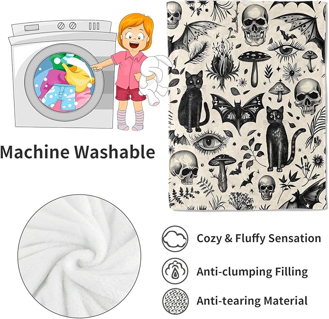 Spooky Goth Blanket Gothic Black Cats, Skulls, and Bats Throw Blankets Gifts for Girls Boys Adults Lightweight Soft Fleece Cozy for Sofa Couch Bed Room Travel Birthday Halloween Decor 60x80in