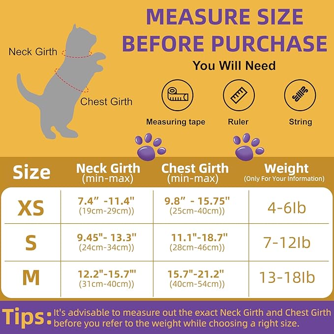 - ESCAPE-PROOF CAT HARNESS: The escape proof cat harness features two snap-on & off quick-release buckles for easy wear and removal. With four adjustable straps for the neck and chest, achieving the perfect fit is simple, allowing for a snug yet comfortable fit.Tips: It's advisable to measure out the exact Neck Girth and Chest Girth before you refer to the weight while choosing a right size.