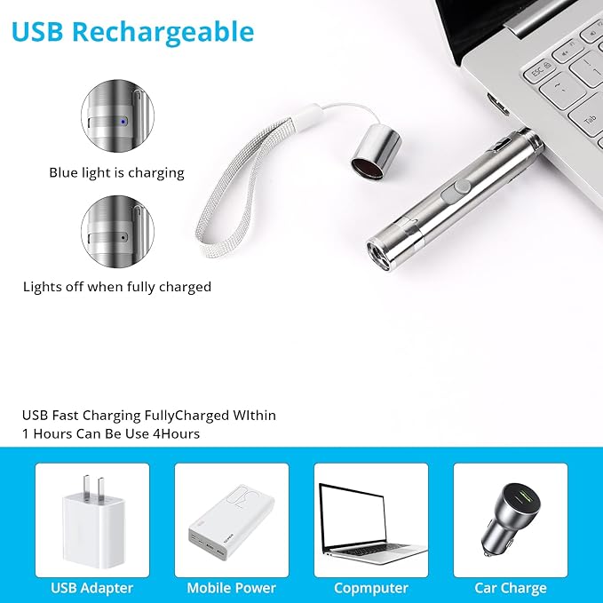 - 【Multiple Function】The cat wand toy is versatile. It can also be used as a pointer for presentations, with a bright beam for clear visibility. You can turn it on with a single push, no need to hold down the button. The lighting mode can glow in the dark, and the purple mode can detect counterfeit money.